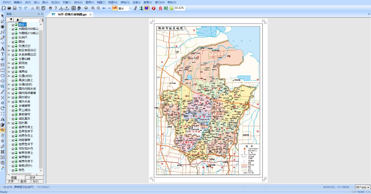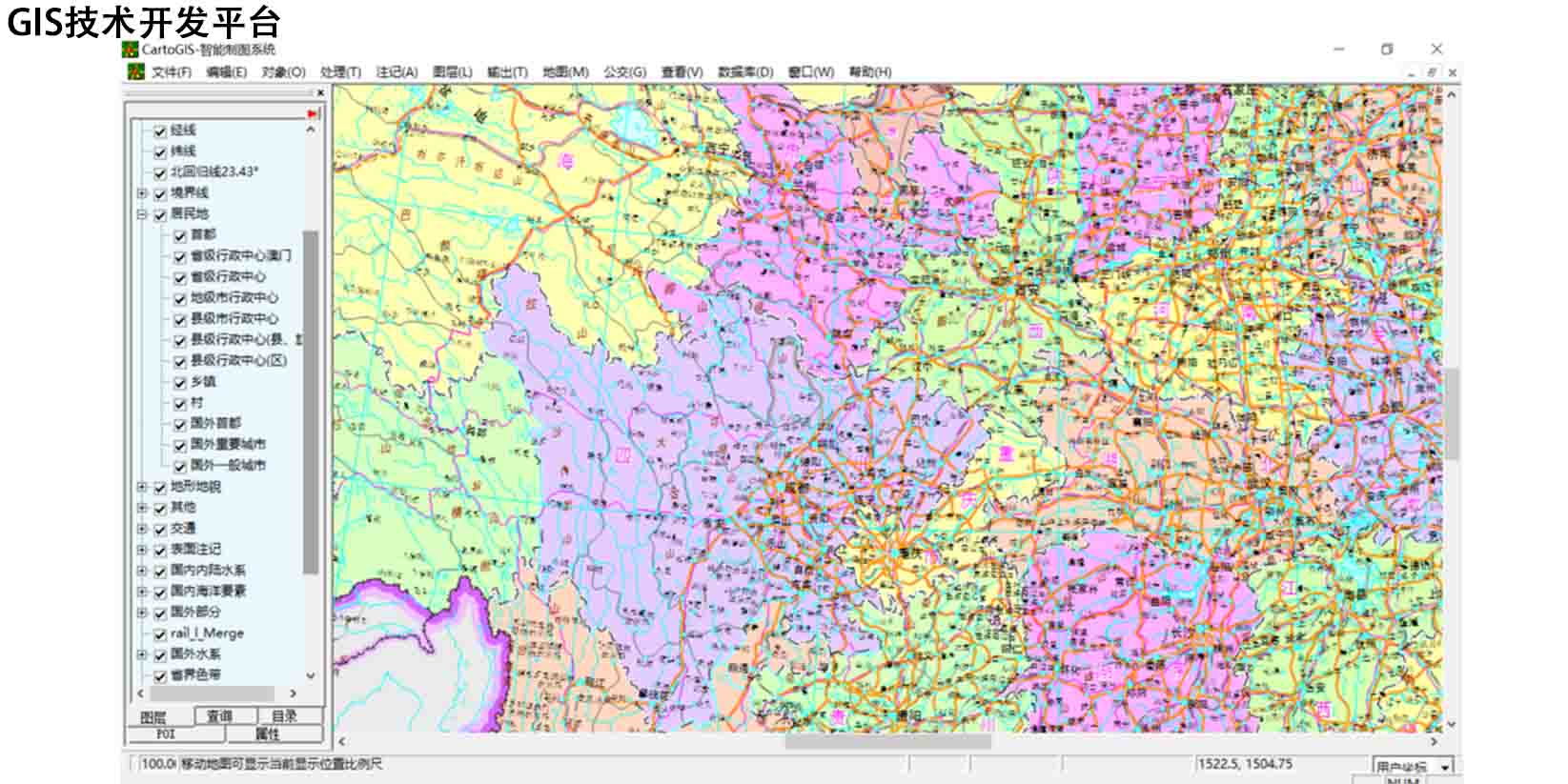 CartoGIS是专业的地图制图软件,基于VC++底层研发而成,融入了地图制图专家思想、优秀研究成果和国标规范。它充分借鉴和吸收了国内外专业地图制图软件、通用图形软件的功能特长,以地图制图理论和地图制图实践为纲,以快速制图工艺为目标,建立了以地图数据库为核心的快速地图制图现代化生产技术体系。它包含地图建库、快速制图、地图缩编、专题制图、应急制图、地图质检、地图输出等核心功能。它充分考虑了SHP、GDB等制图前端数据源的兼容性和后端CorelDraw、Illustrator等图形软件的兼容性,达到了数据批量可视化导入,及“所见即所得”矢量导出。